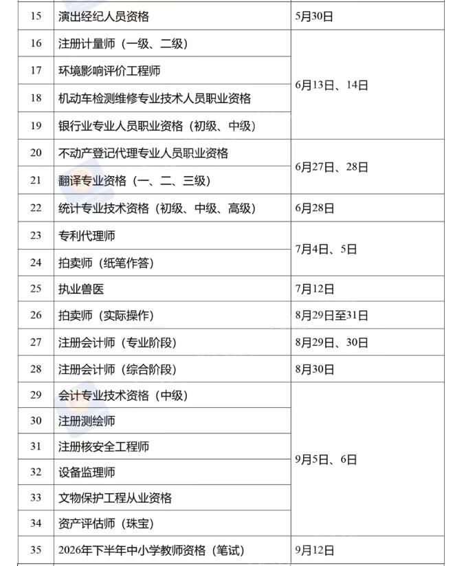 定了!2026年度专业技术人员职业资格考试时间表公布→