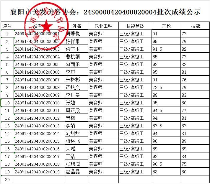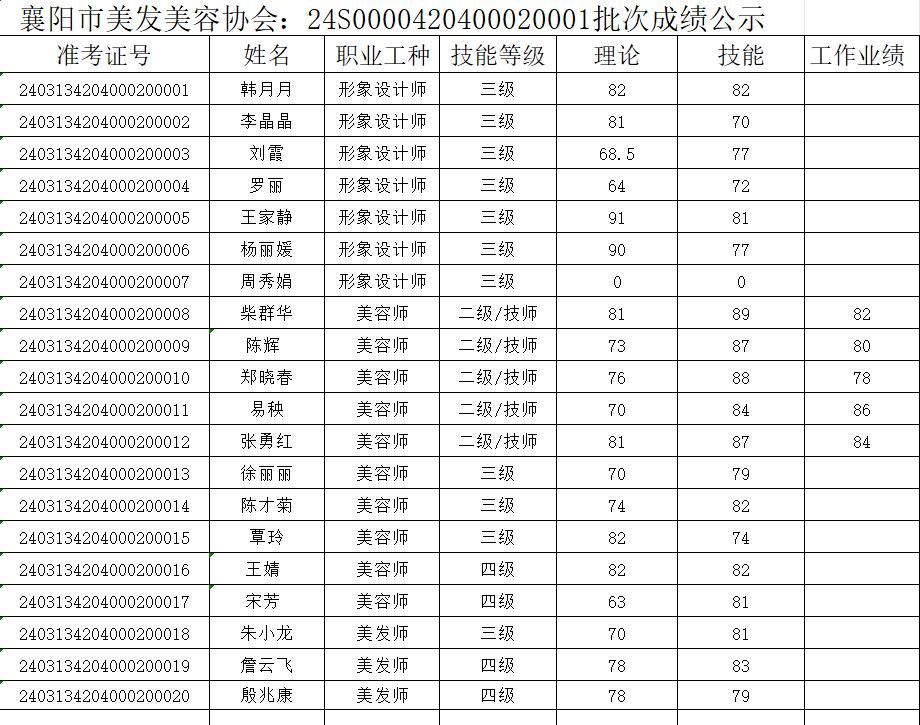 20250428襄阳市美发美容协会樊城区第1批认定:美容师、美发师、形象设计师成绩公示